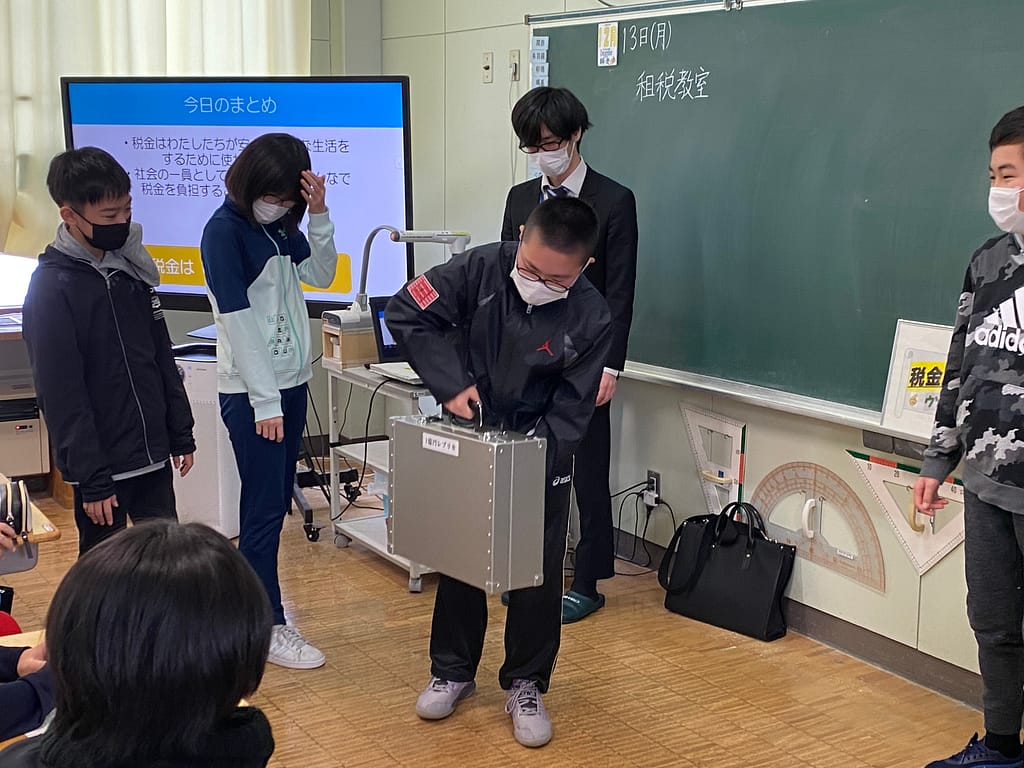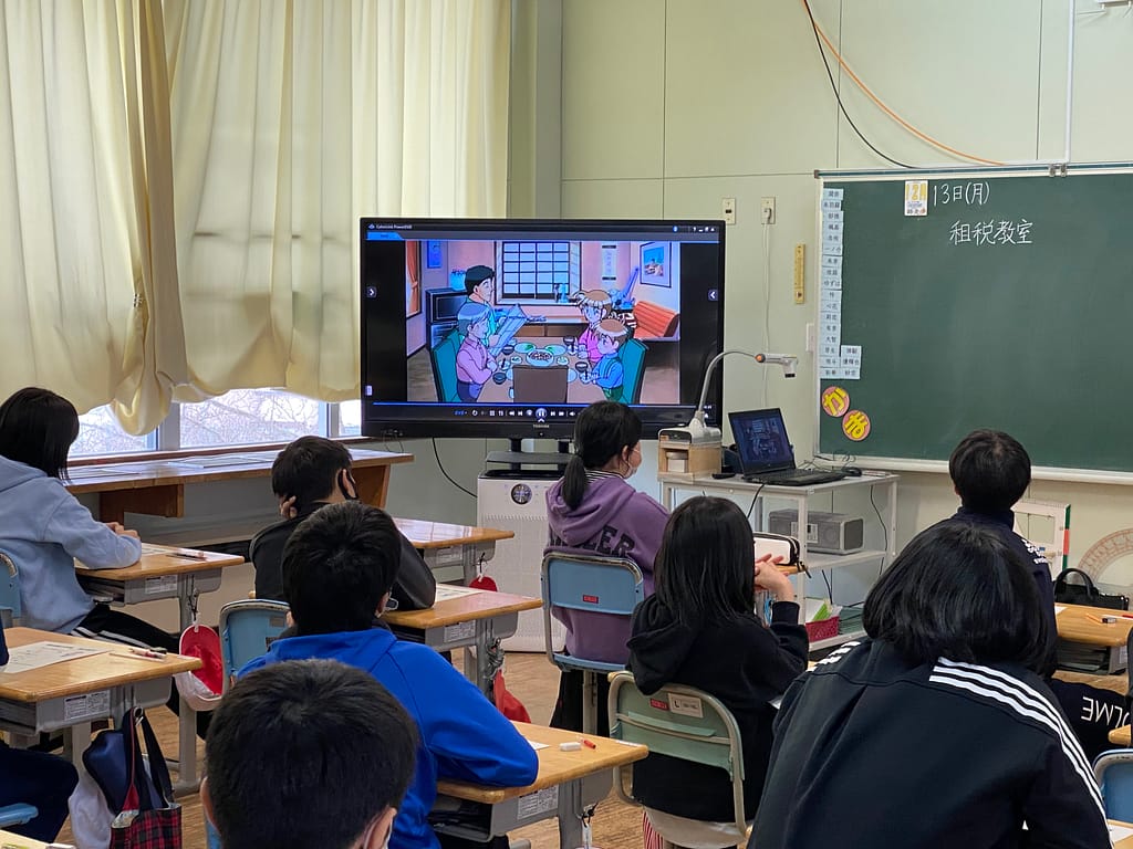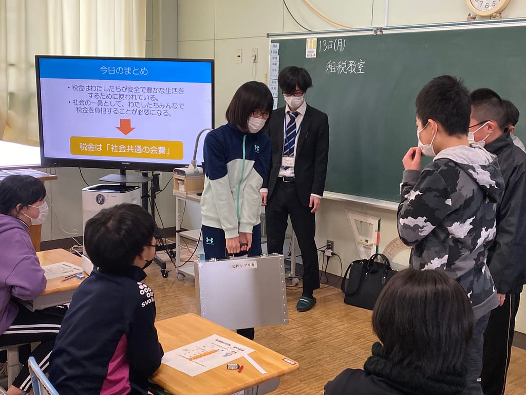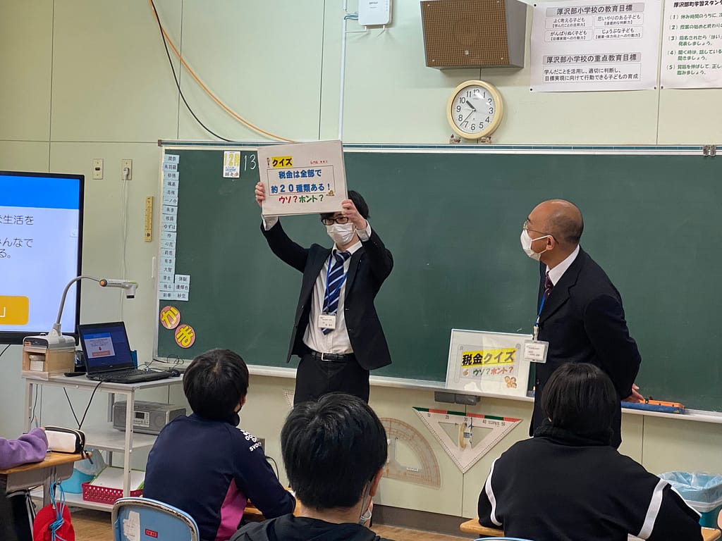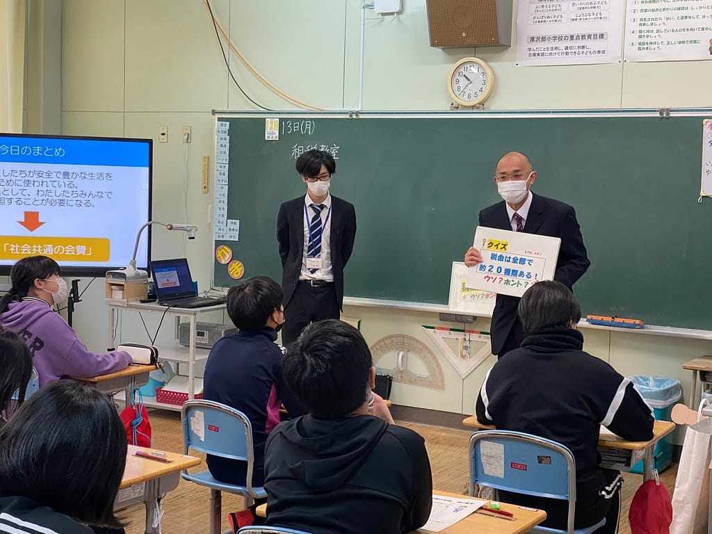 先日、檜山振興局税務課 古明地 友暢 課税係長 と、碇 海斗 主事 をお招きし、本校6年生を対象に租税教室が開かれました!
