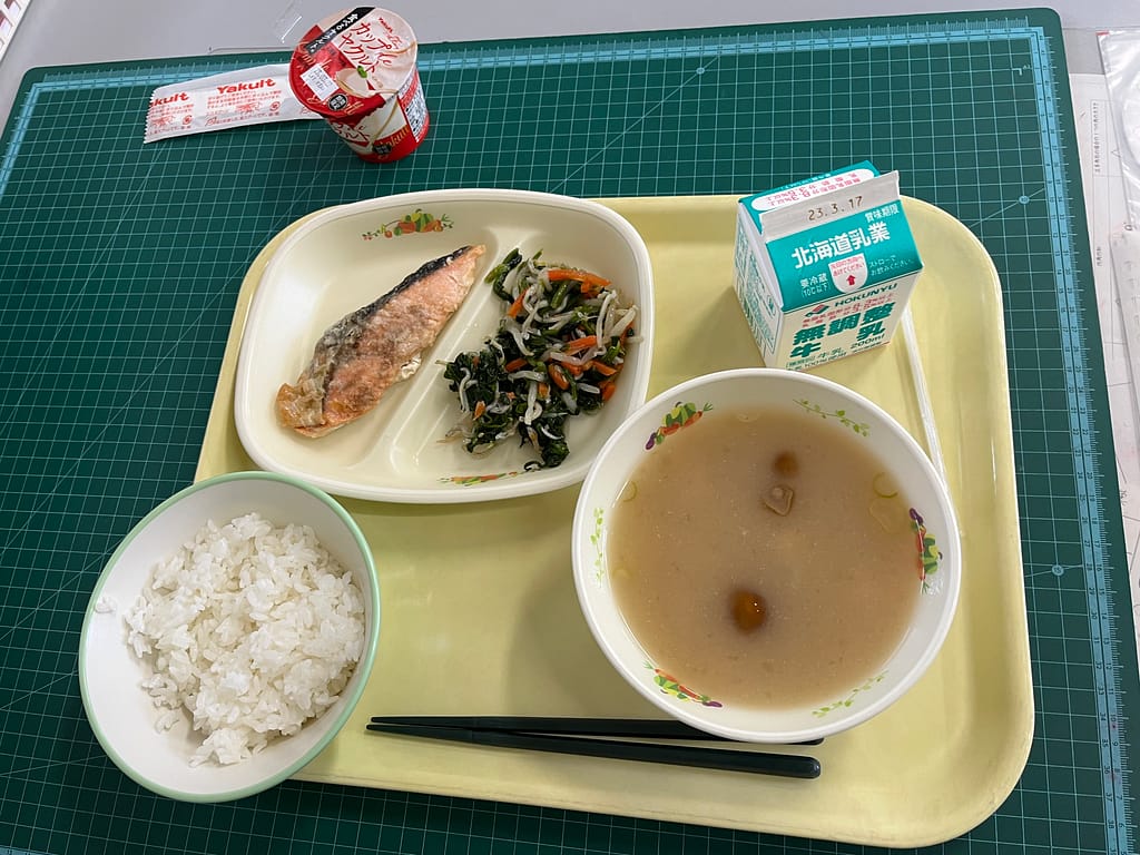 ・ごはん ・みそ汁(なめこ、長ネギ、豆腐) ・鮭のムニエル