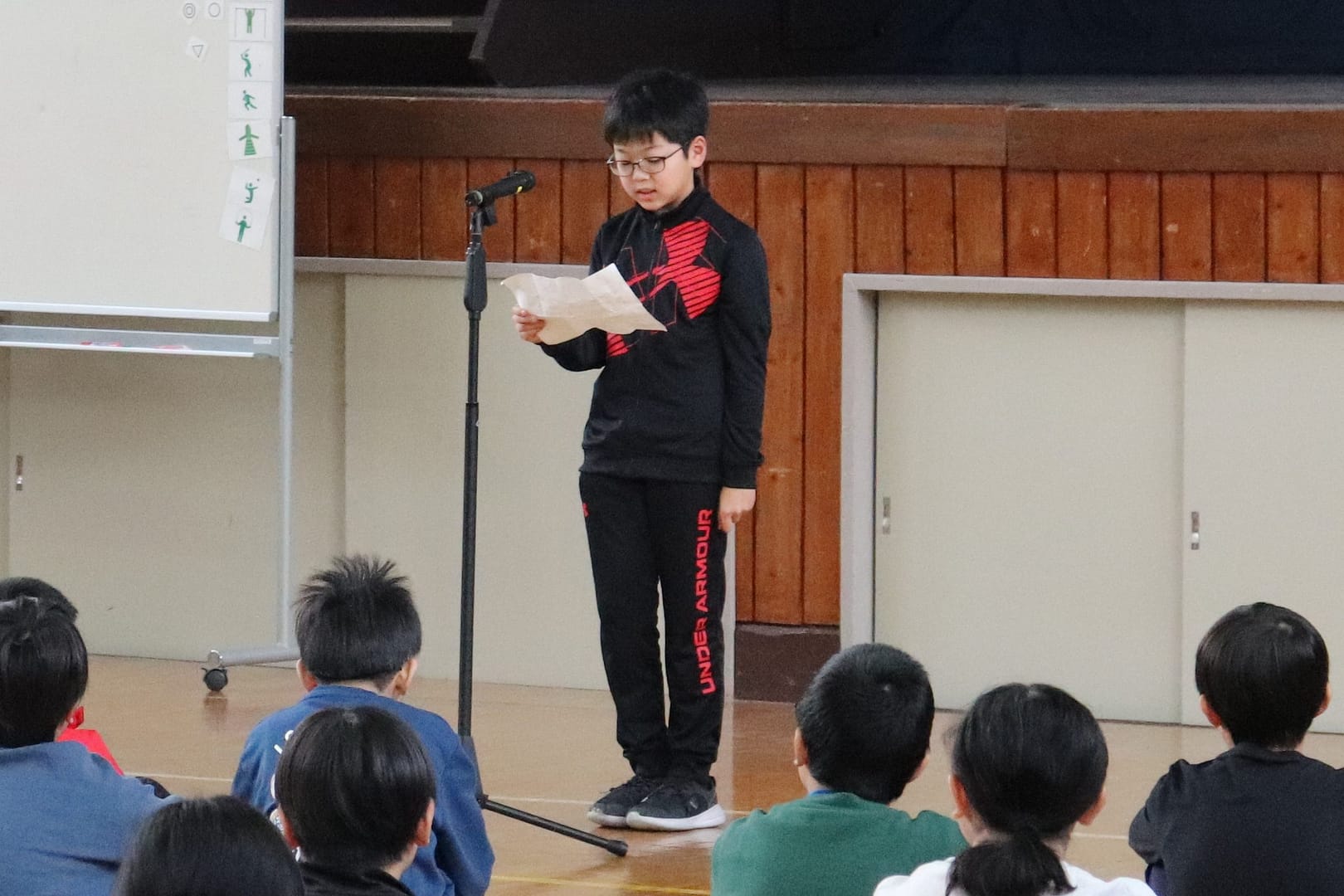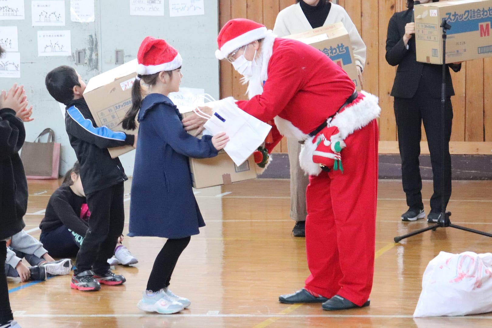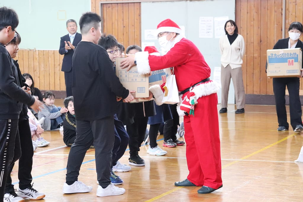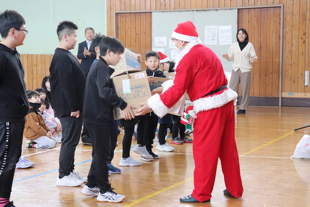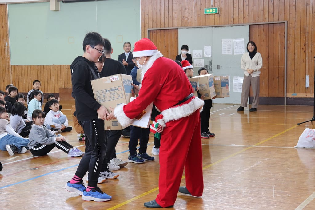 各学年の代表者へ、サンタさんよりプレゼントが渡されました。