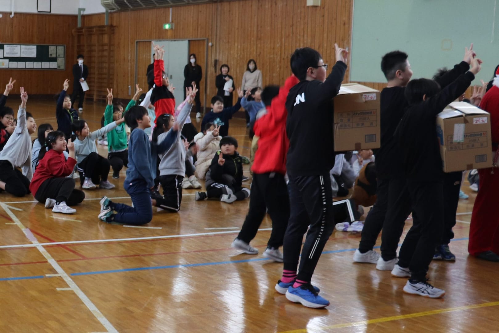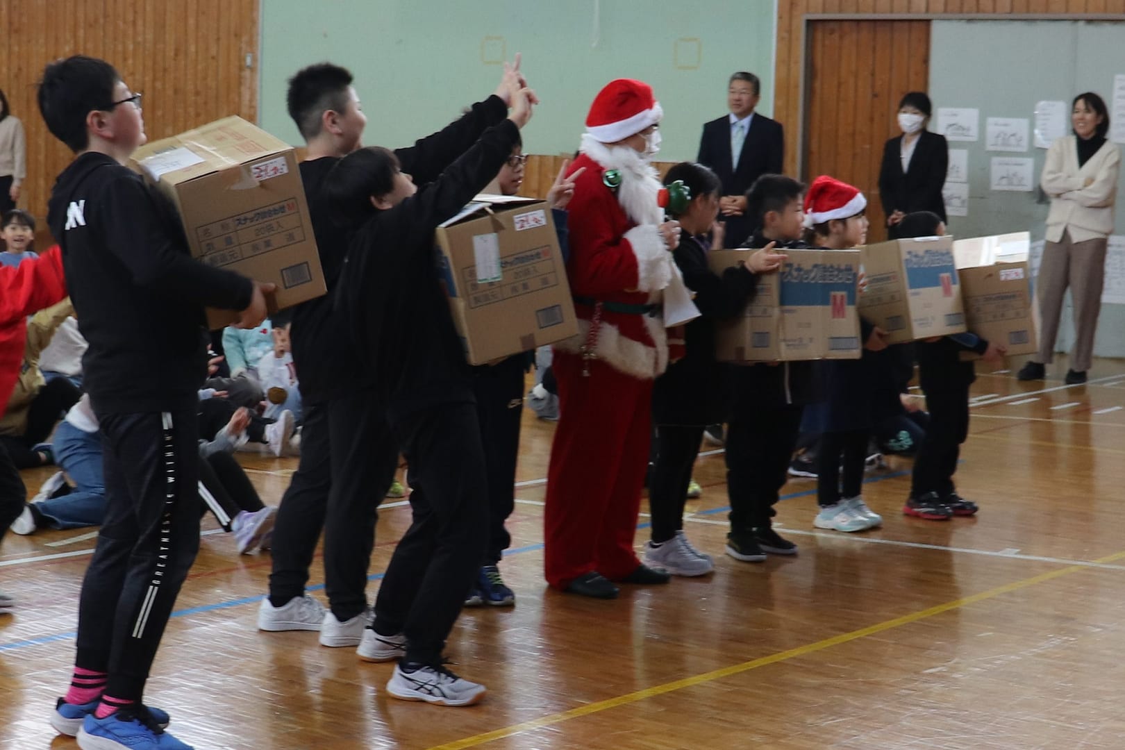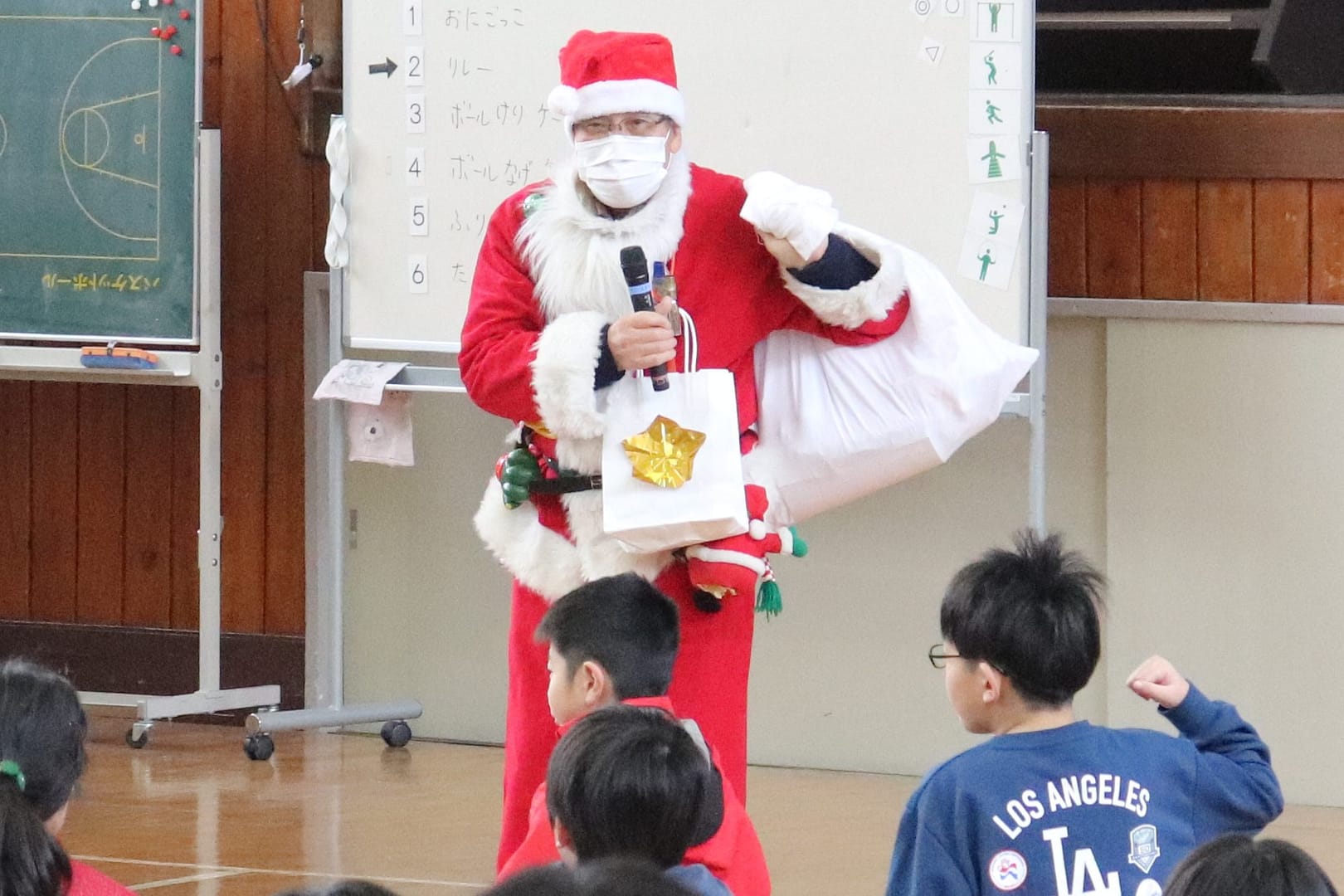 終業式後、湯田サンタさんが登場しました。