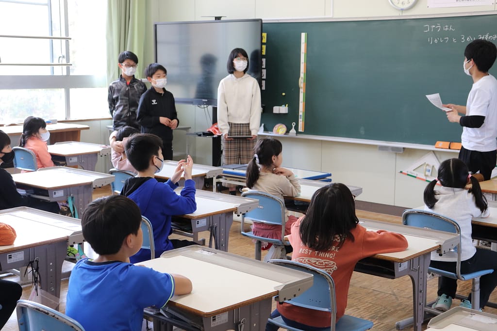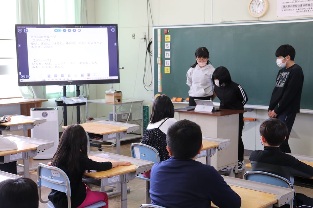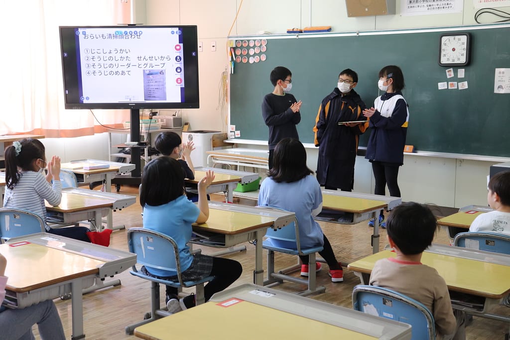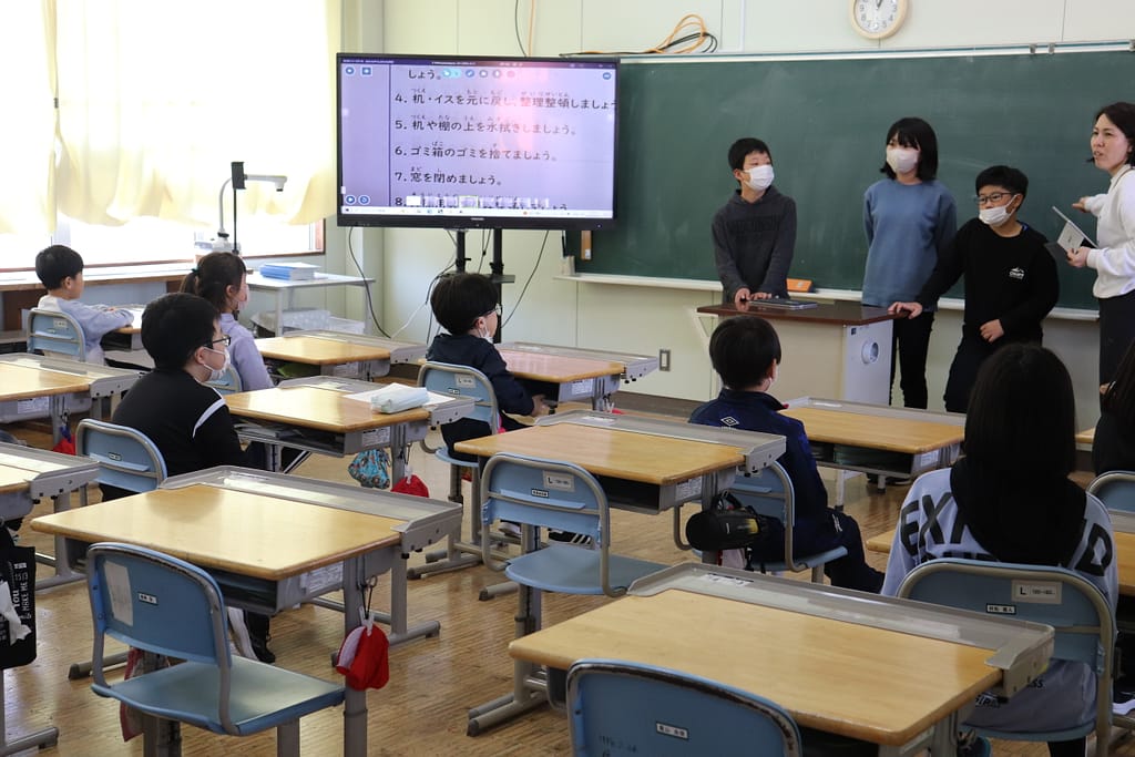 1年生の教室には班ごとにお迎えが来て、それぞれ別の教室でメンバー確認や清掃場所の確認などを行いました。
