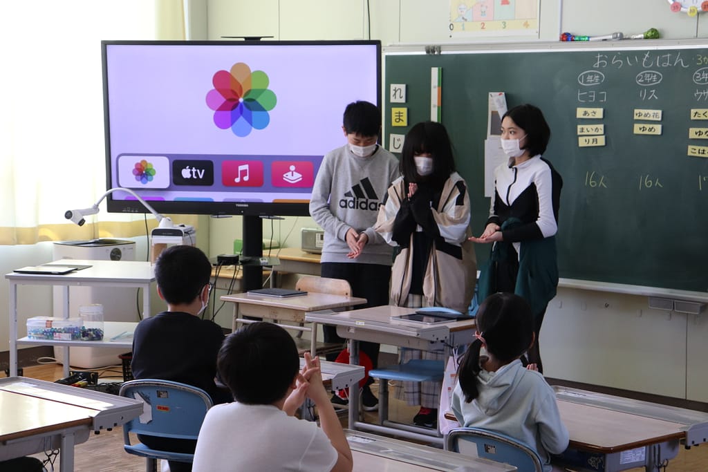 おらいも活動とは、「1年間、各学年数名ずつの6班に分かれて活動する異学年交流です。」