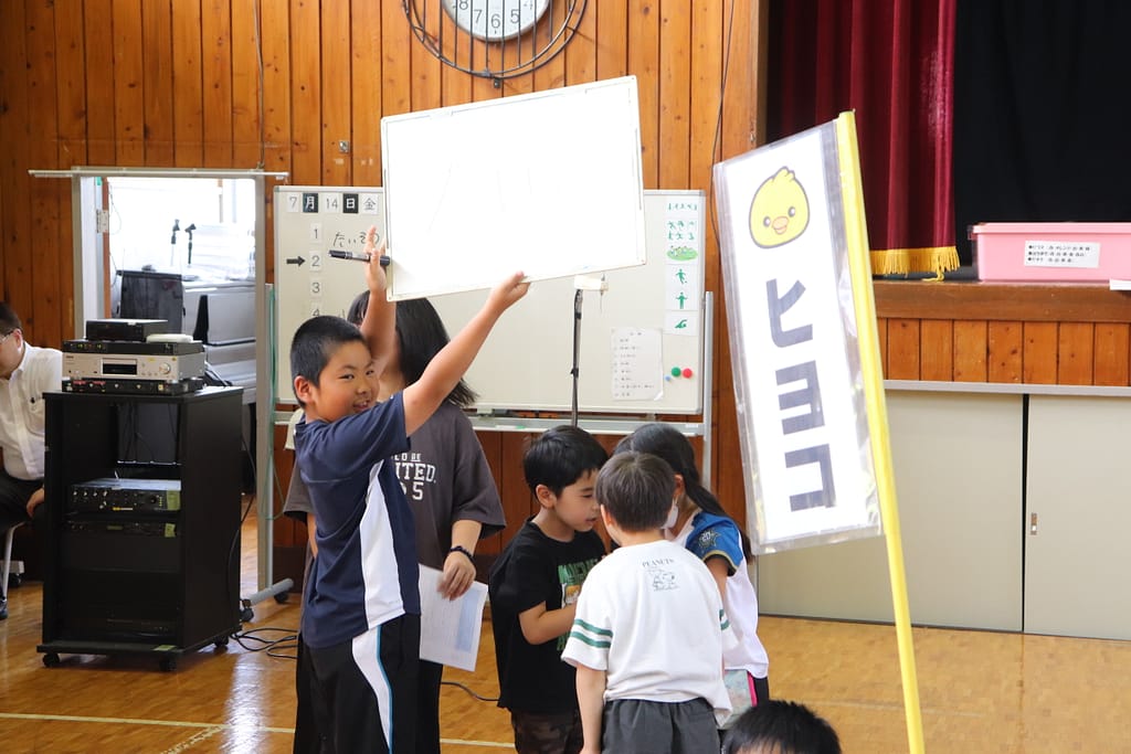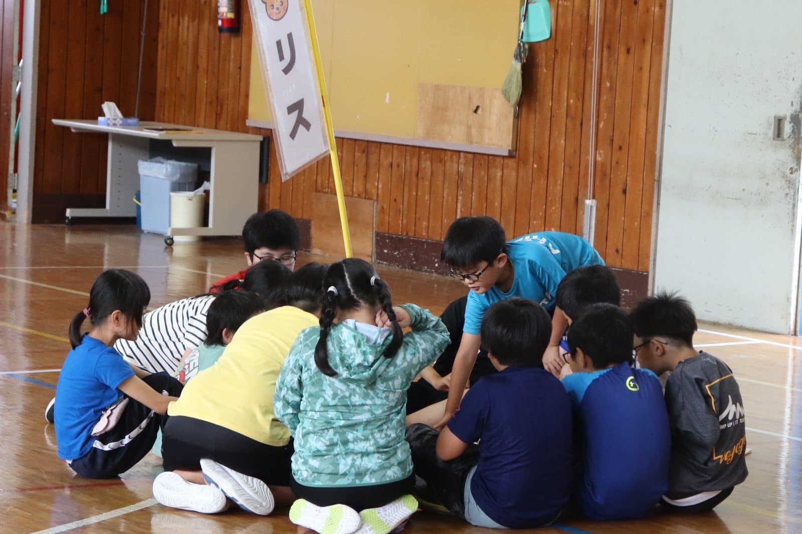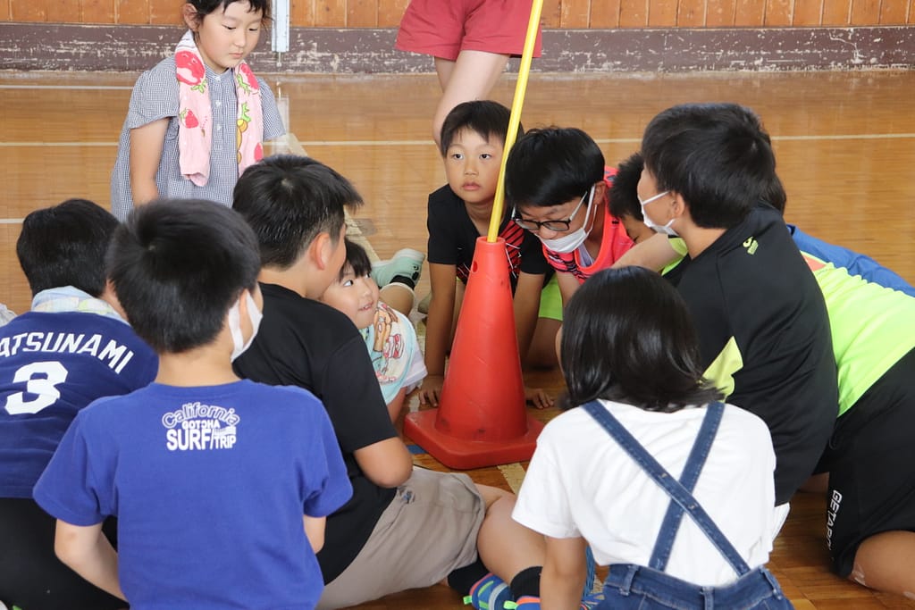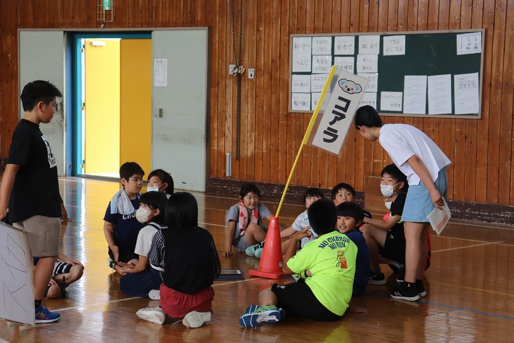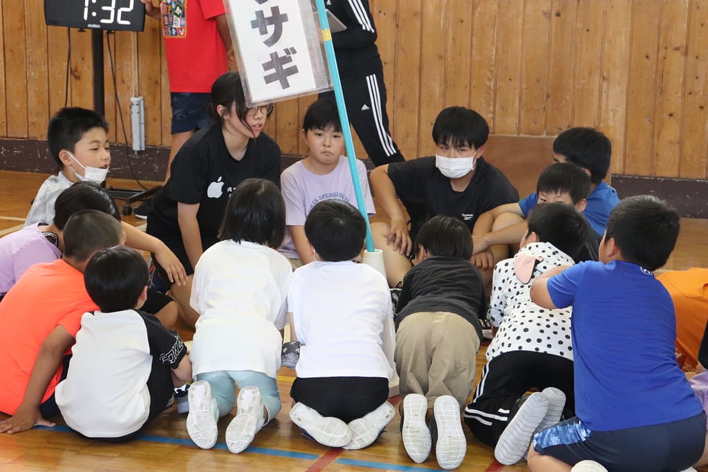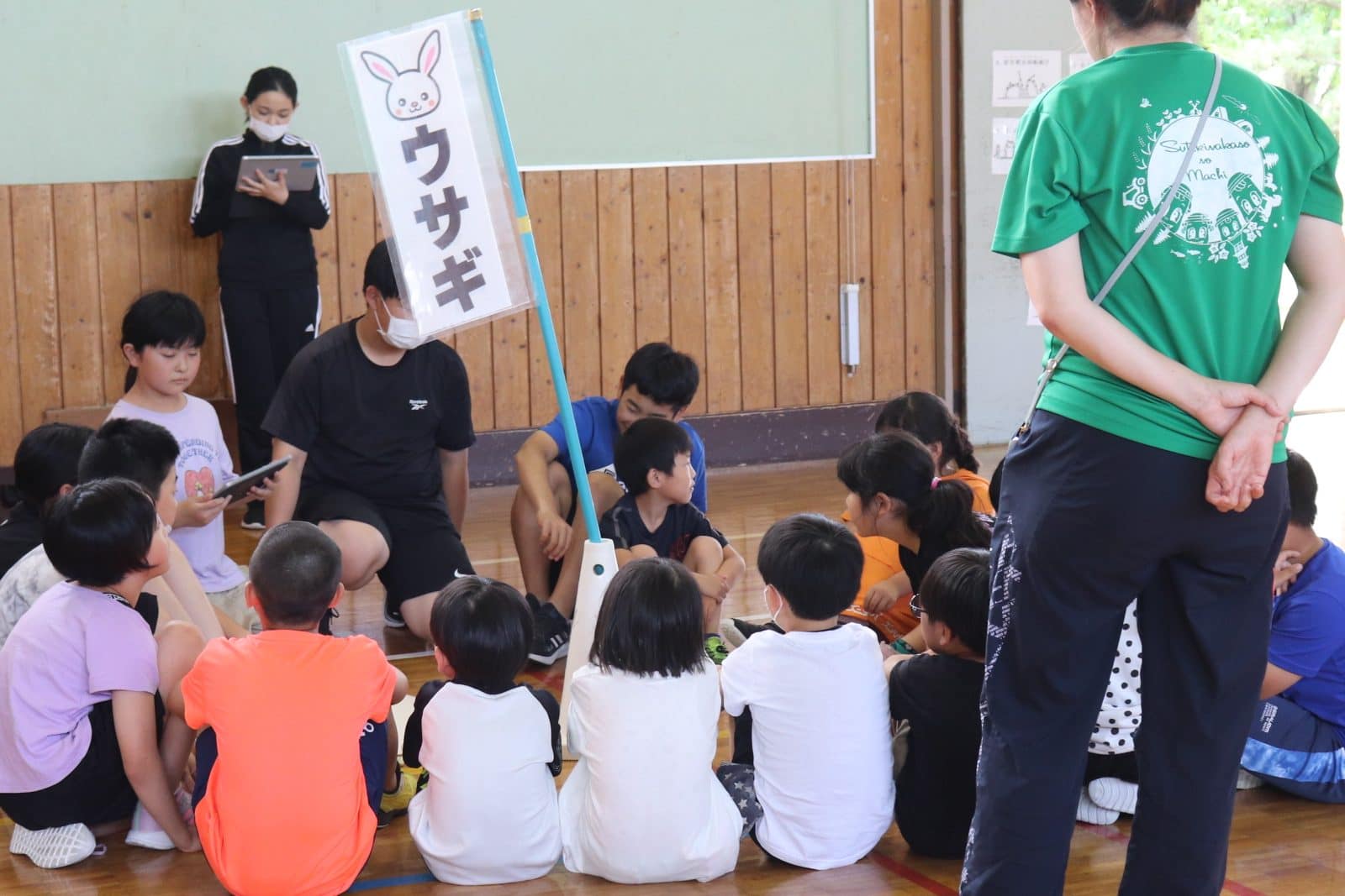 各班で旗の周りに集まり、タブレットから再生される問題を聞きます。