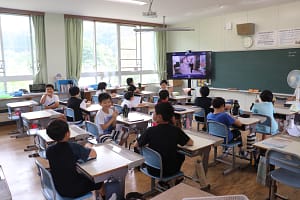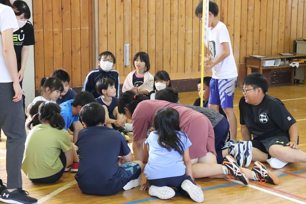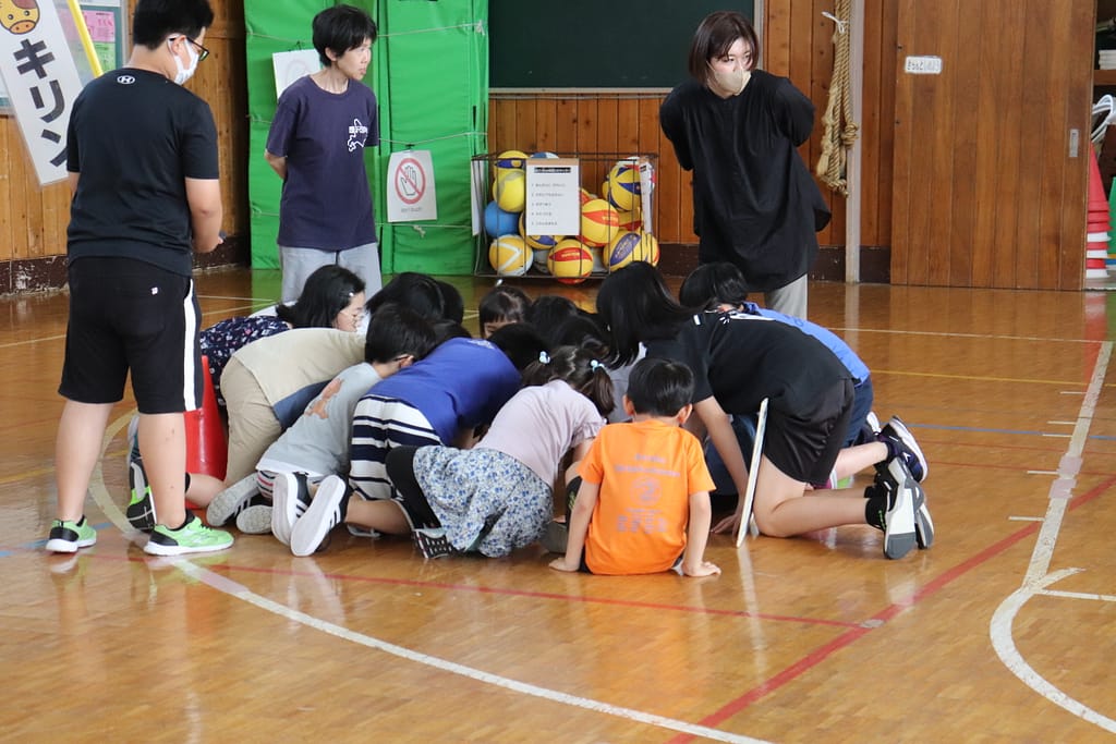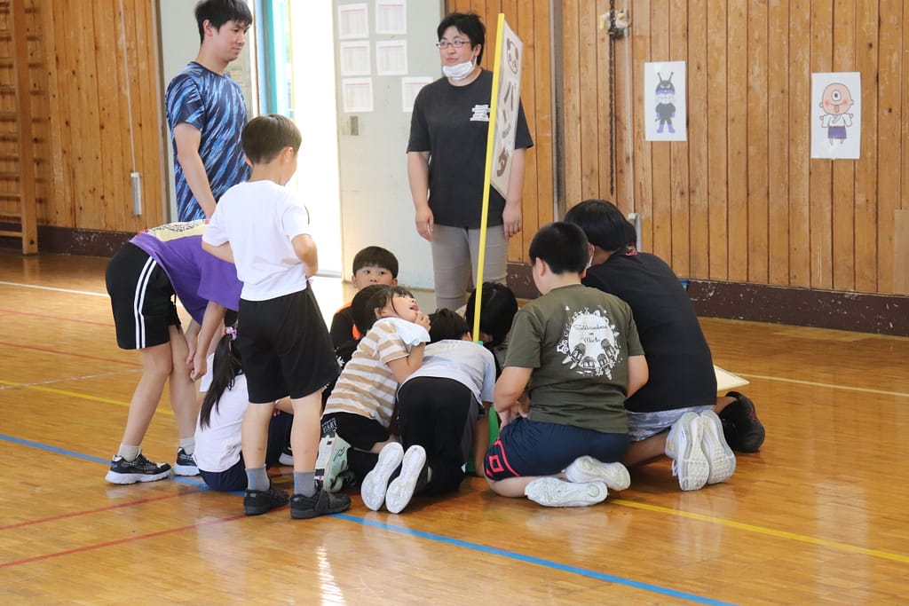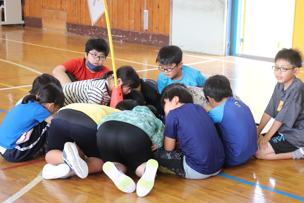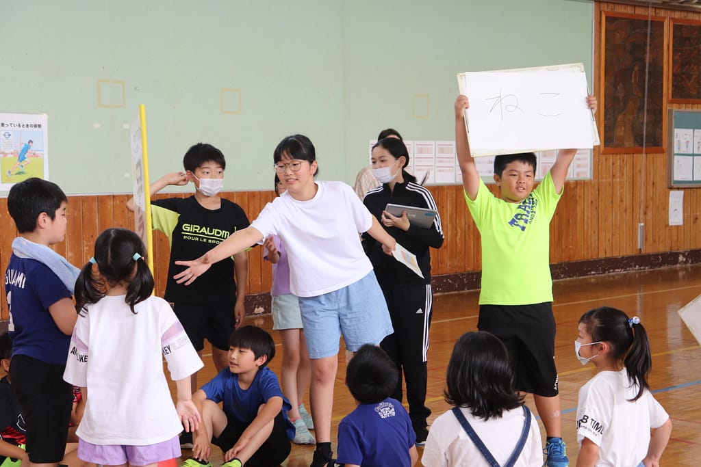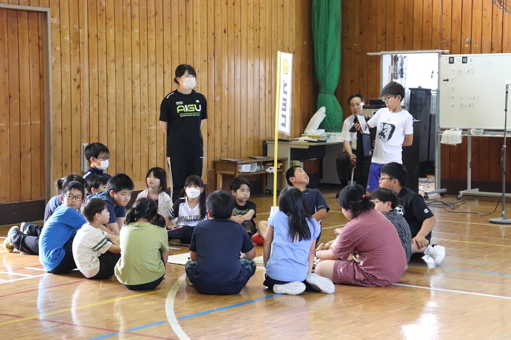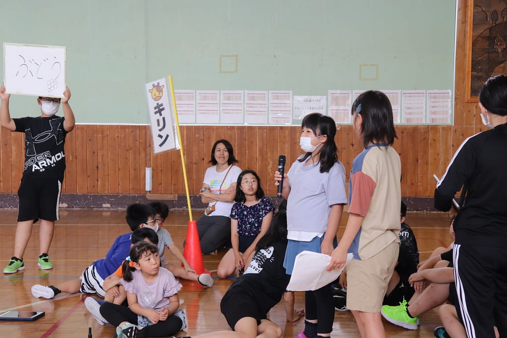 各班で旗の周りに集まり、タブレットから再生される問題を聞きます。