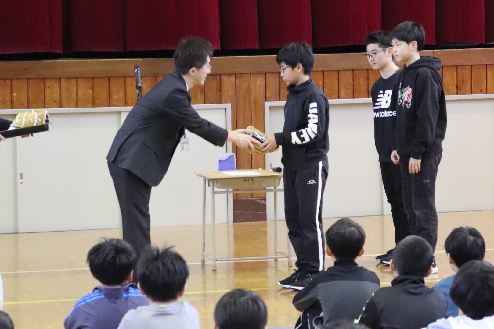 高野政人教育長より代表の児童3名が受け取りました。