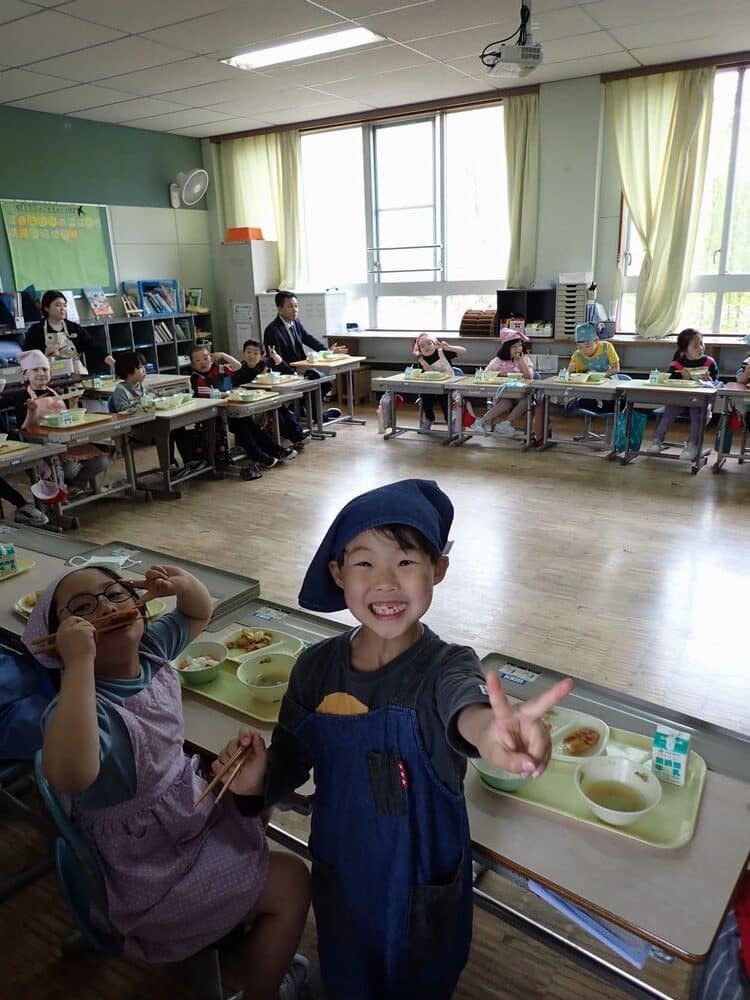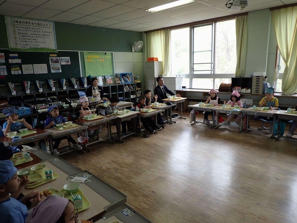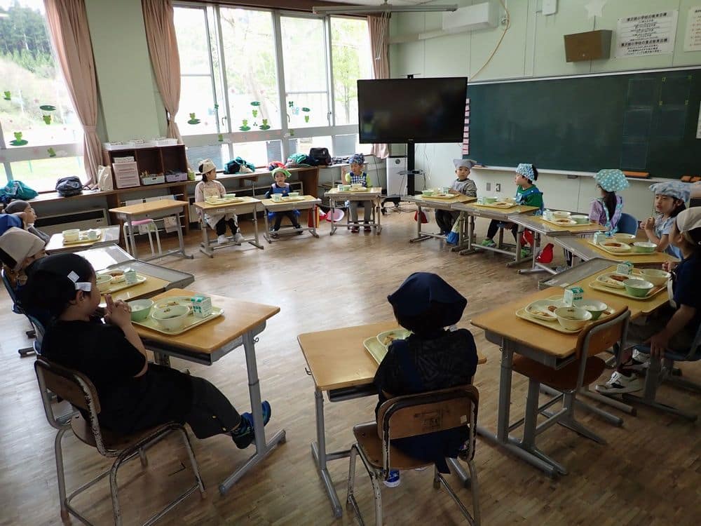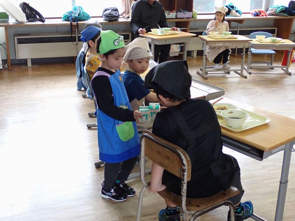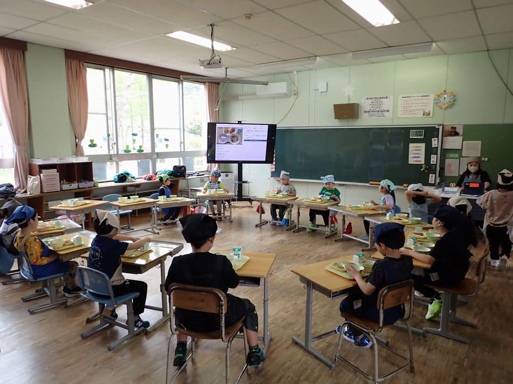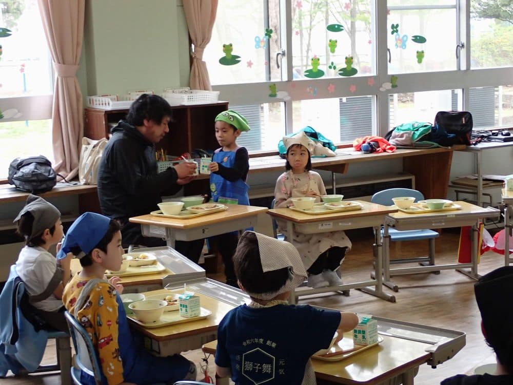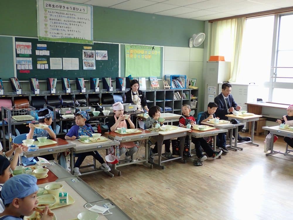 写真の後半は、1・2年生の教室でそれぞれ学年別に給食交流を行なっているものです。今年度から、2校のみの交流となったため体育だけではなく、給食と休み時間の交流も加えました。
