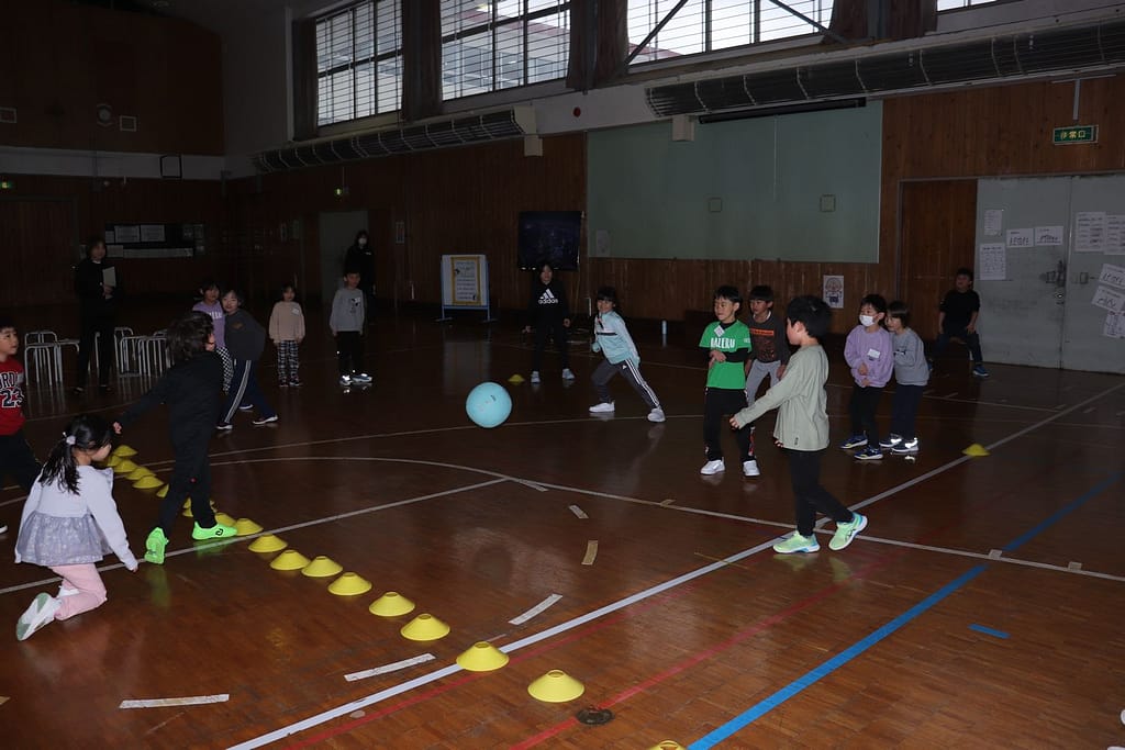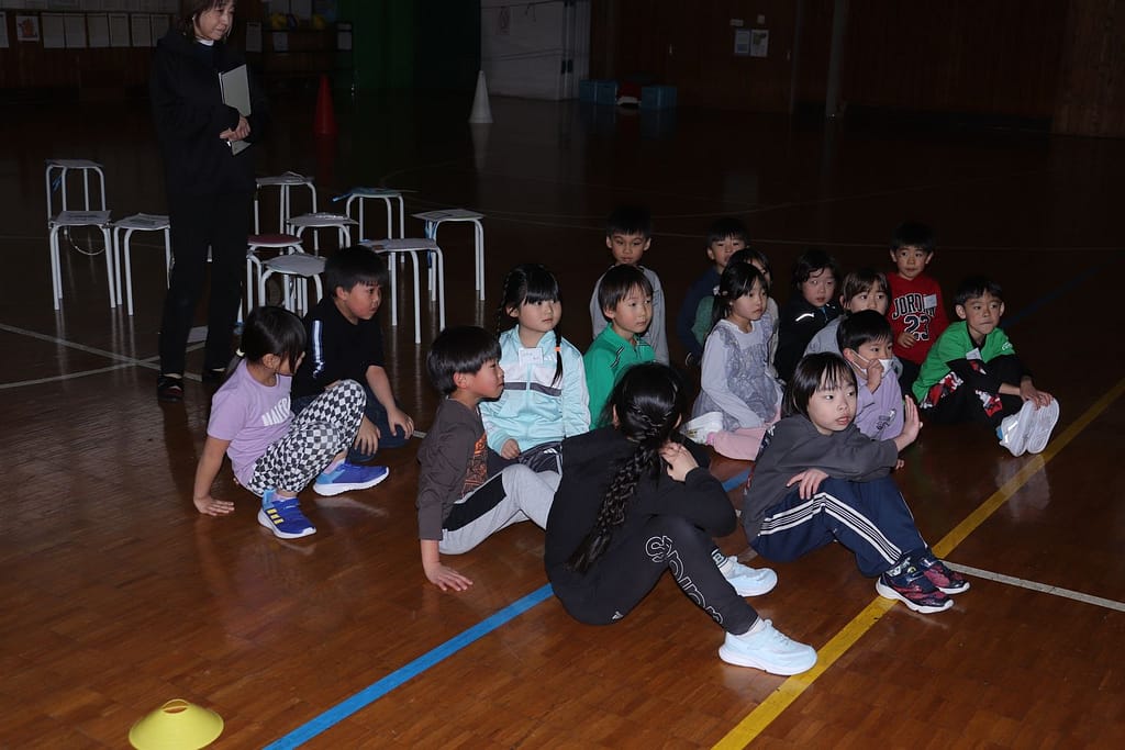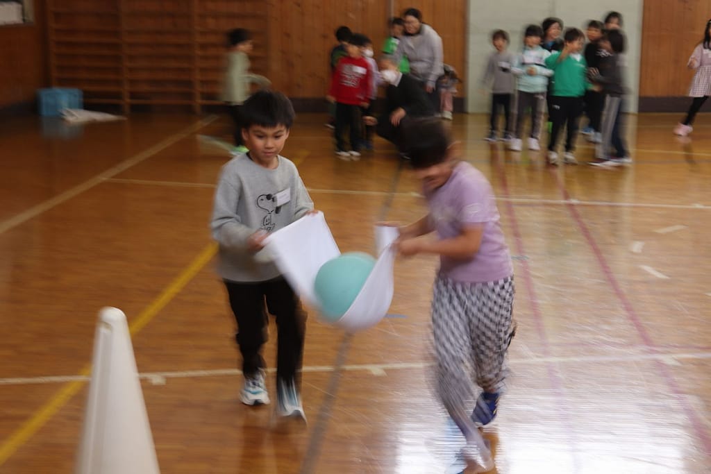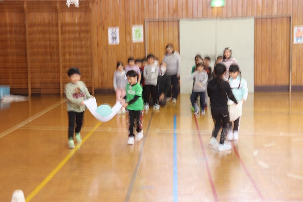 新1年生の1日入学が、2月10日火曜日に行われました。保護者のみなさんへのご説明の時間、新1年生は、先輩の1年生といっしょに体育館で運動遊びなどを楽しみました。「フルーツバスケット(学校バージョン)、ボール運びリレー、王様ドッジボール」の3つです。