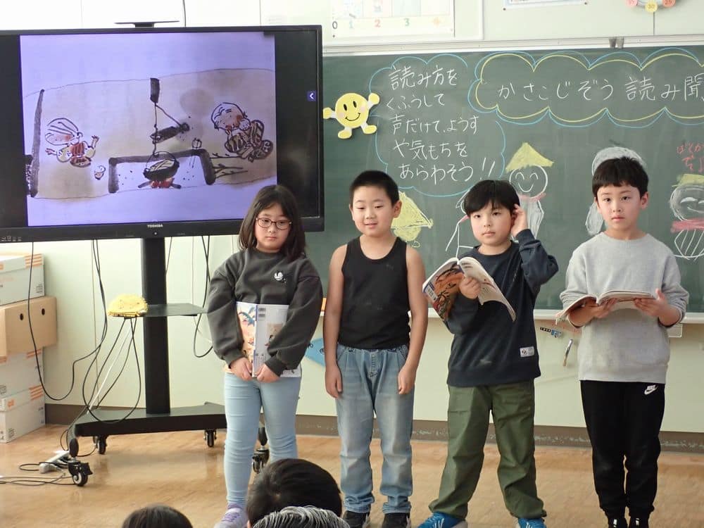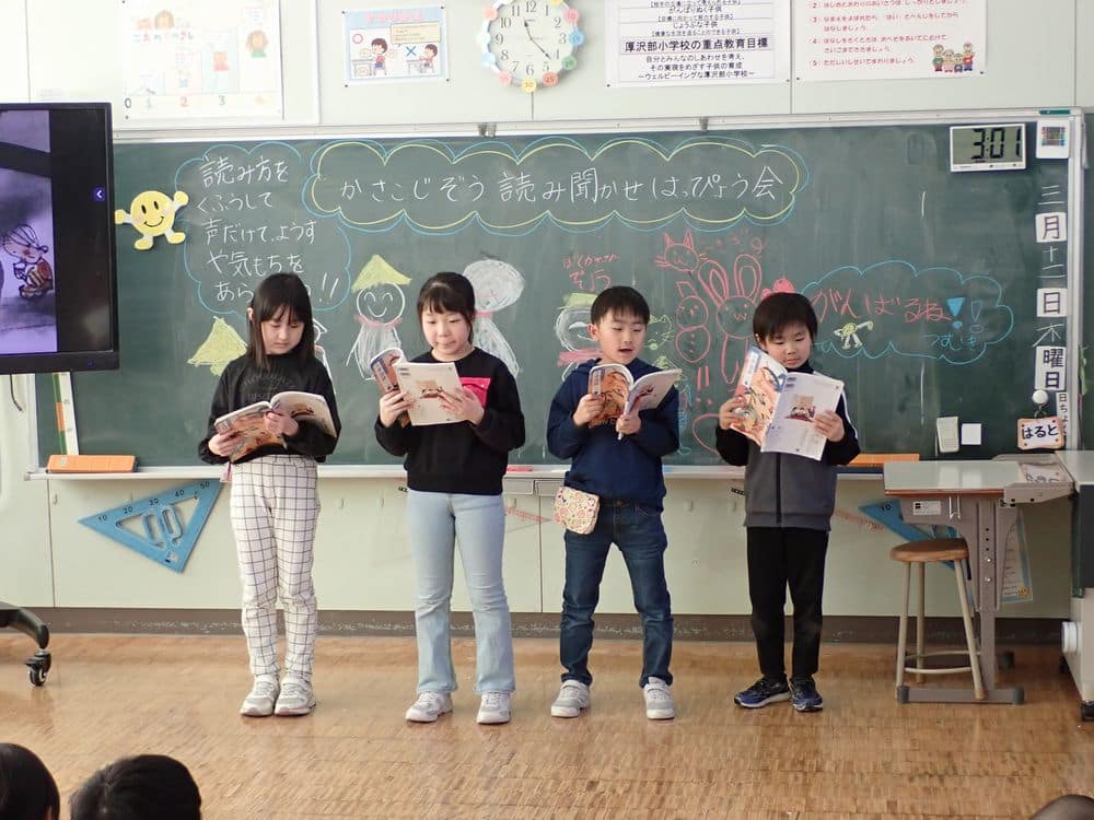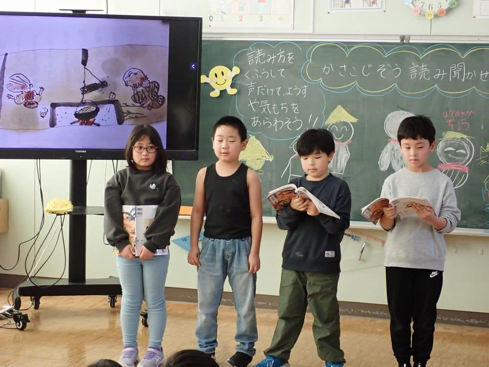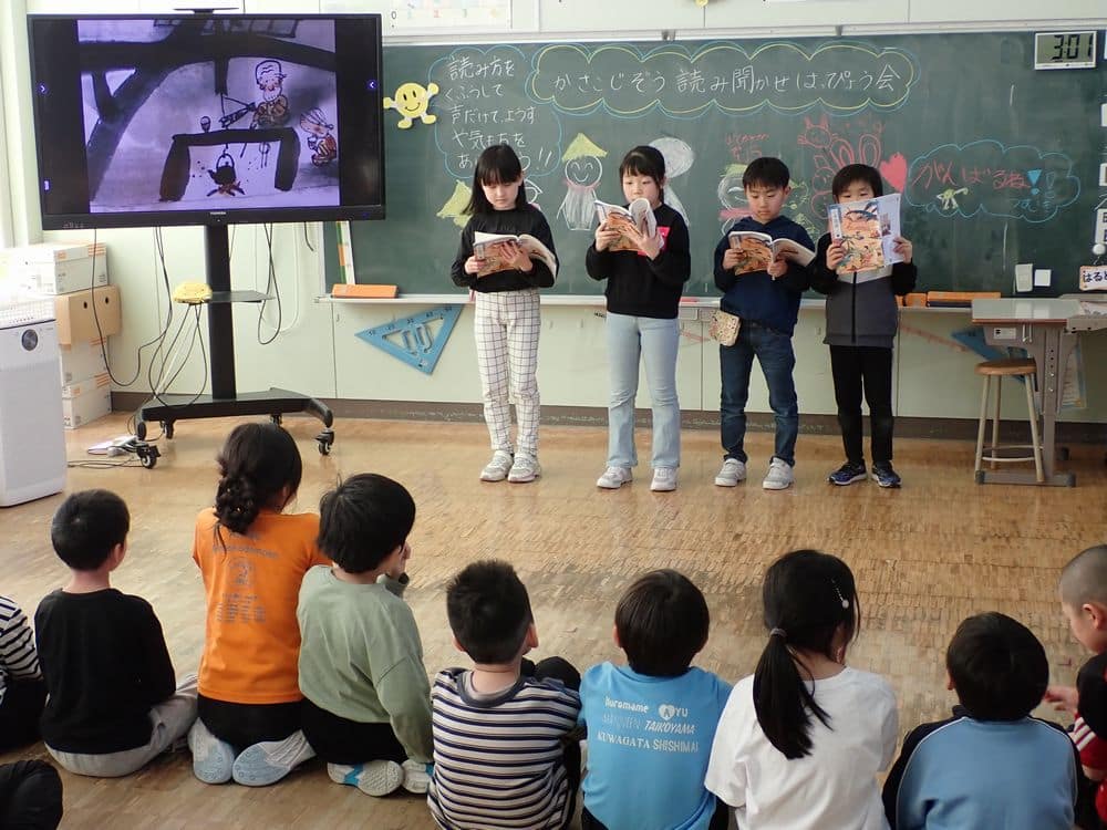 3月12日木曜日、標記活動が教室に1年生と先生方をお招きして行われました。2年生は、登場人物やナレーターになりきって、豊かに音読で表現しました。