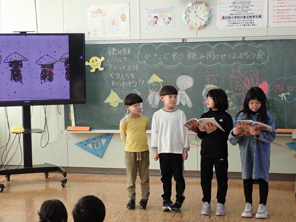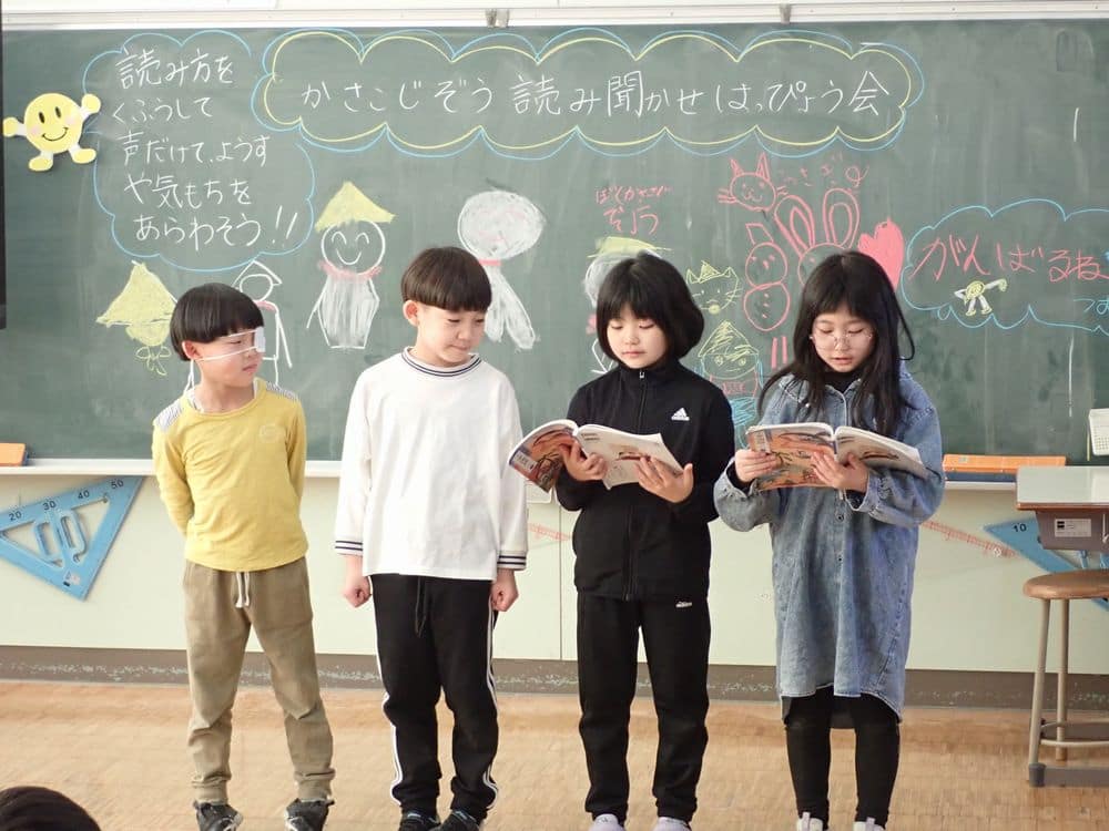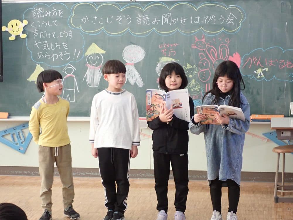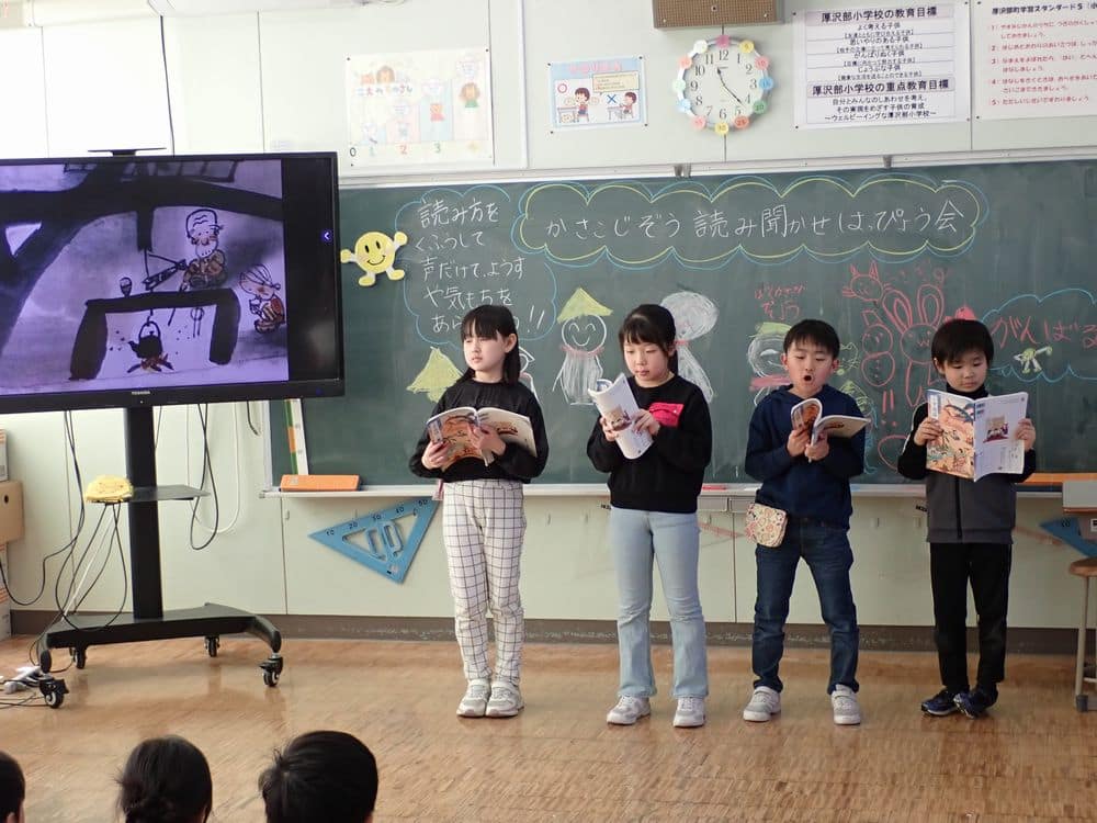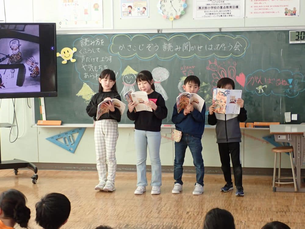 3月12日木曜日、標記活動が教室に1年生と先生方をお招きして行われました。2年生は、登場人物やナレーターになりきって、豊かに音読で表現しました。