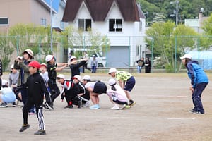 3年生・4年生による団体競技です。 台風の目 台風のようにコーンの周りを回って戻ってきたら、棒をみんなの頭上を通し、足元を通して次の組と交代します。コーンでの回り方やみんなとの呼吸の合わせ方(特に足元を通す時)がキーポイ […]