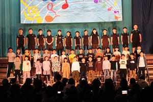 学習発表会の様子、1・2・3年生の部最後は1・2・3年生全児童による合唱です。みなさんとても元気な歌声を聞かせてくれました。 校歌・青い空に絵をかこう